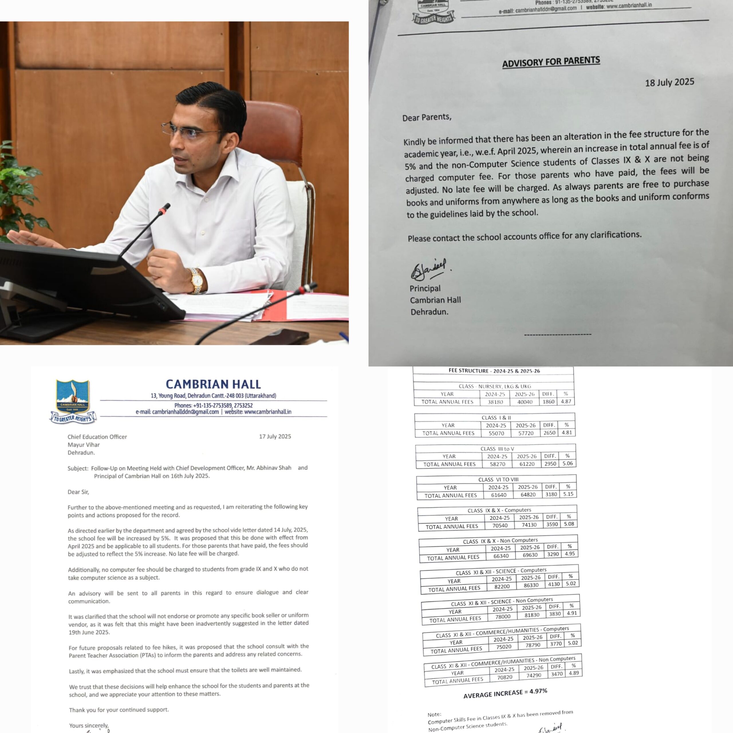 मा0 मुख्यमंत्री के निर्देश और जिला प्रशासन के आक्रामक रवैये से कैंब्रियन हॉल स्कूल अब बैकफुट पर आ गया है। स्कूल ने मनमाने तरीके से 10 प्रतिशत फीस वृद्वि को 05 प्रतिशत कम कर दिया है। जिलाधिकारी सविन बंसल के निर्देशों पर नियमों का पालन न करने वाले स्कूलों के खिलाफ कडा एक्शन लिया जा रहा है। जिला प्रशासन द्वारा स्कूल पर सख्त प्रवर्तन एक्शन के बाद अभिभावकों को बड़ी राहत मिली है।