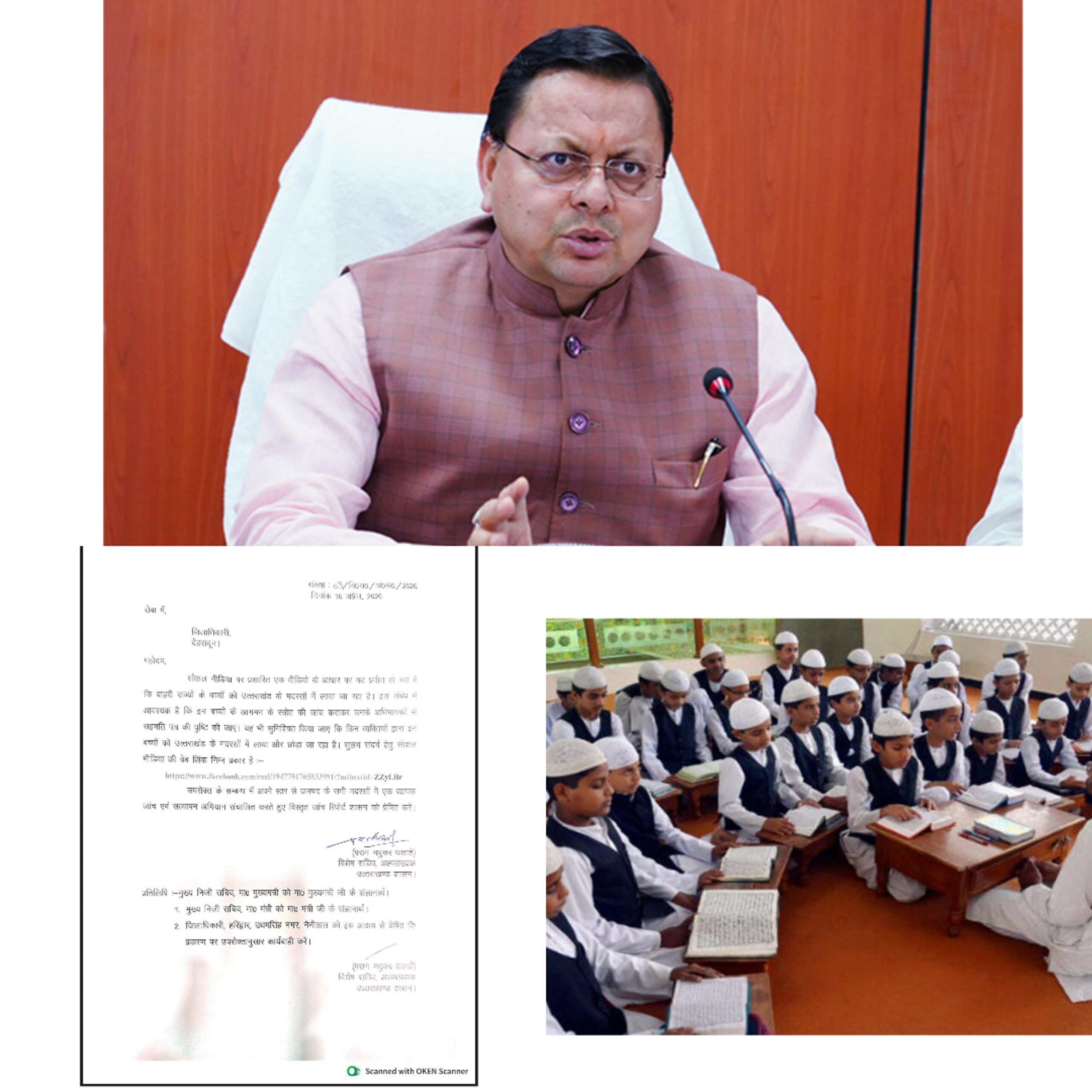 उत्तराखंड शासन के संज्ञान में सोशल मीडिया पर प्रसारित एक वीडियो आया है, जिसमें यह संकेत मिलता है कि बाहरी राज्यों के बच्चों को राज्य के मदरसों में लाया जा रहा है। इस विषय को गंभीरता से लेते हुए शासन ने आवश्यक जांच के निर्देश जारी किए हैं।उत्तराखंड के मुख्यमंत्री पुष्कर सिंह धामी ने बताया कि बच्चों की सुरक्षा, पारदर्शिता एवं नियमों का पालन सर्वोच्च प्राथमिकता है। किसी भी प्रकार की अनियमितता पाए जाने पर कठोर कार्रवाई सुनिश्चित की जाएगी।